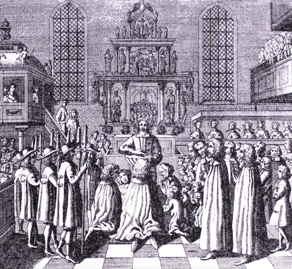 Bilden ovan: Vid ”judedopet” 1681 i Tyska kyrkan i Gamla stan döptes två judiska familjer under stor uppmärksamhet och i närvara av bland andra kungafamiljen som var dopvittnen. Upphov: Okänd, Stockholmsarkivet